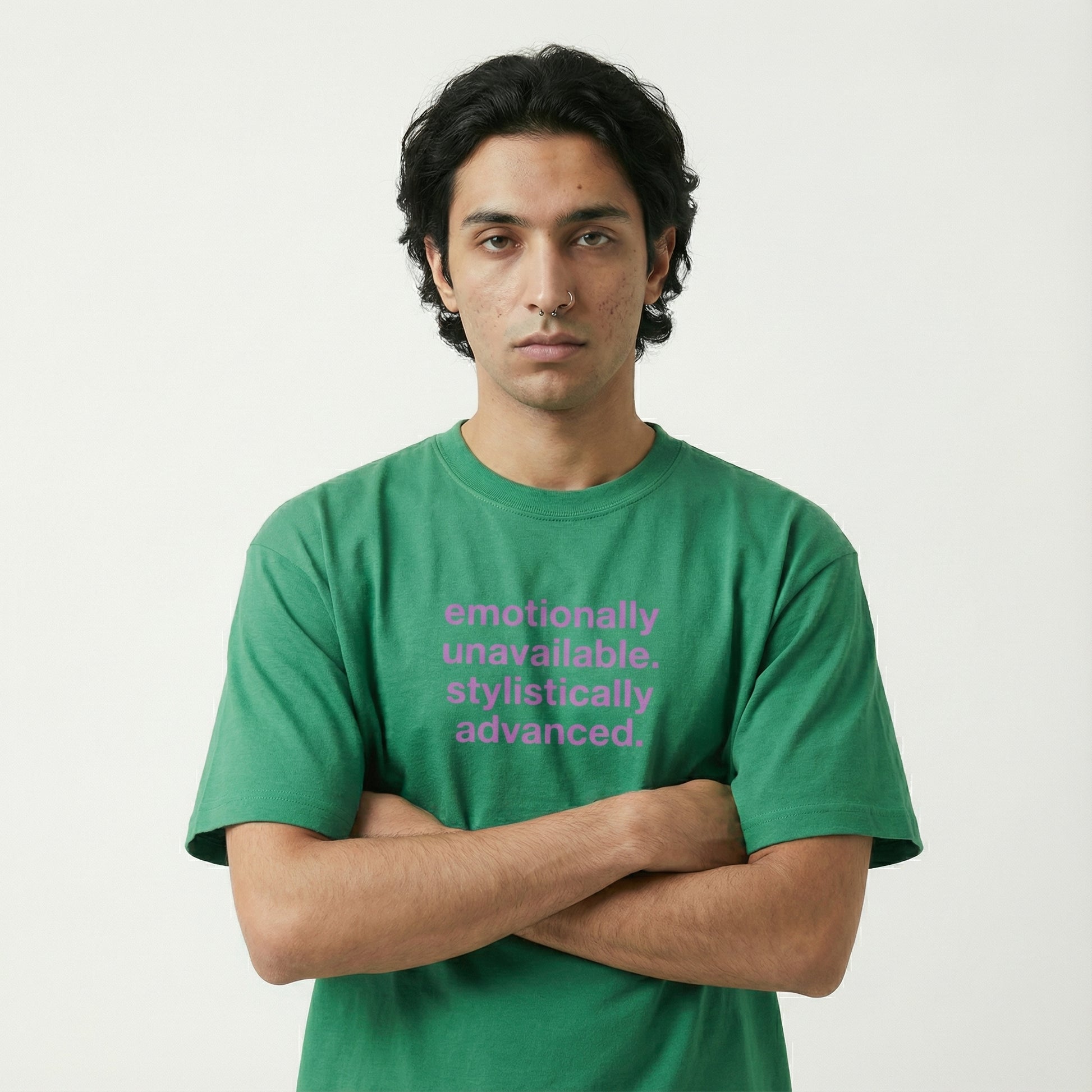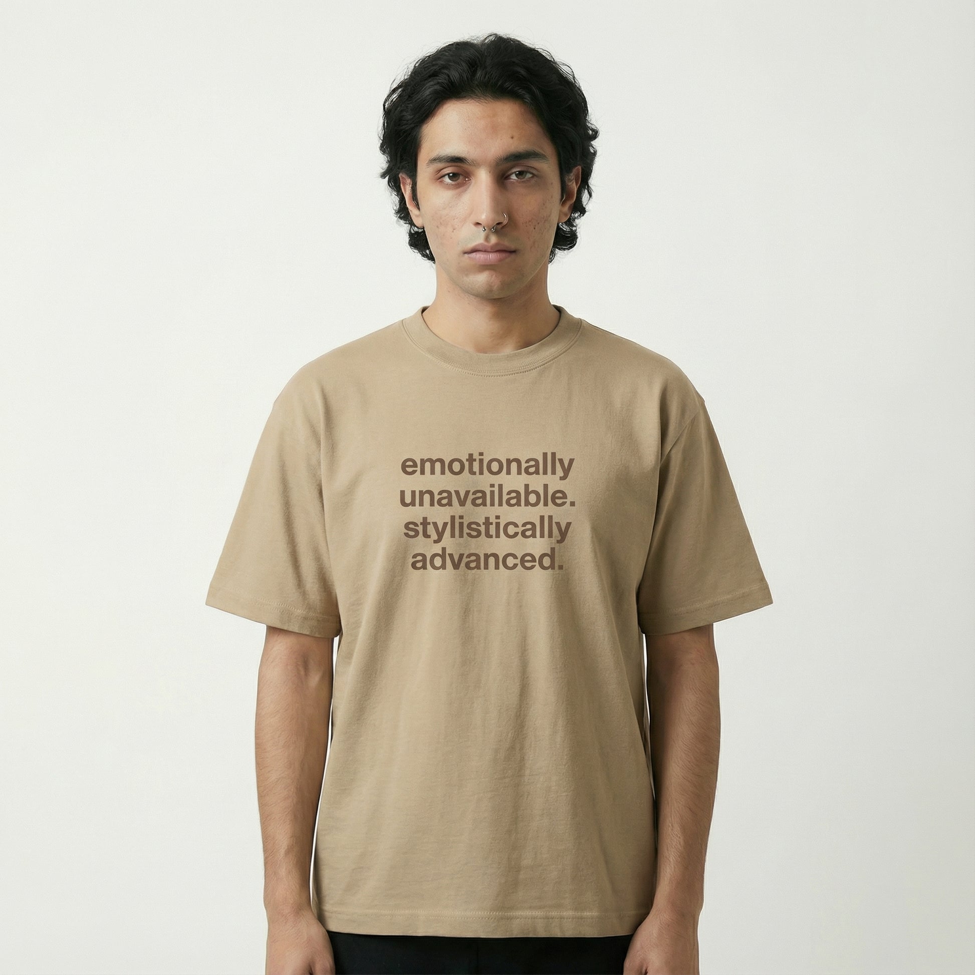 midweight, classic-fit cotton tee with front text reading “emotionally unavailable, stylistically advanced tee.”