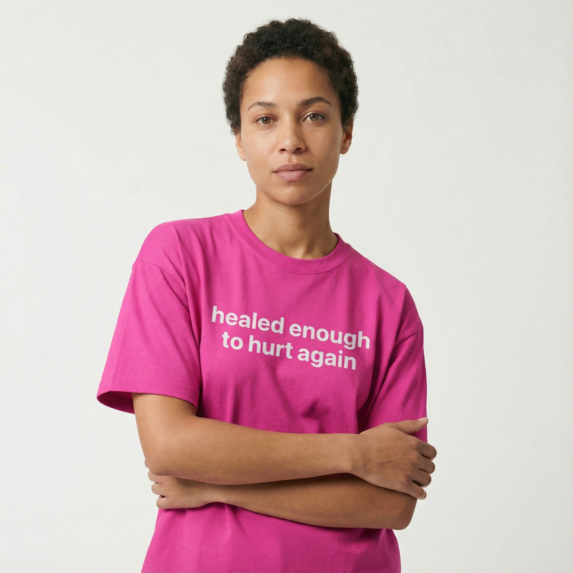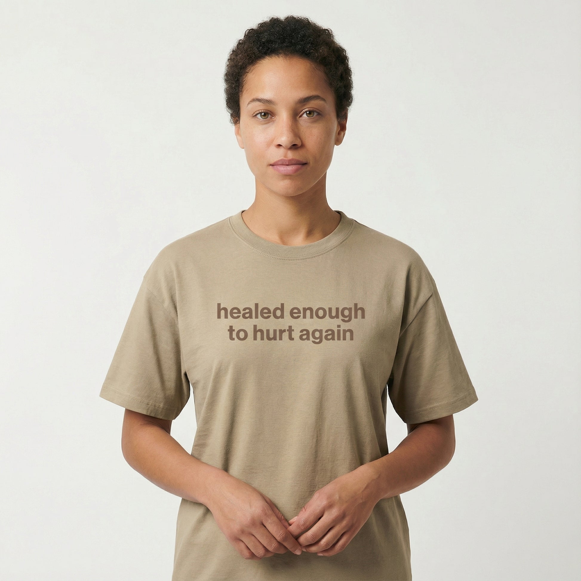 midweight, classic-fit cotton tee with front text reading “healed enough to hurt again tee.”