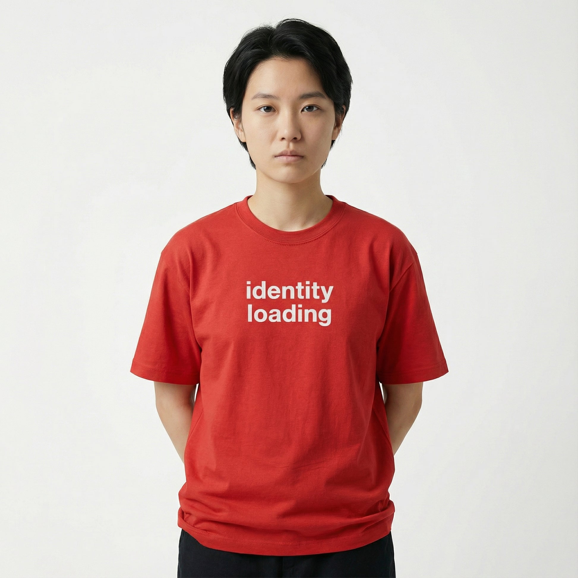 midweight, classic-fit cotton tee with front text reading “identity loading tee.”
