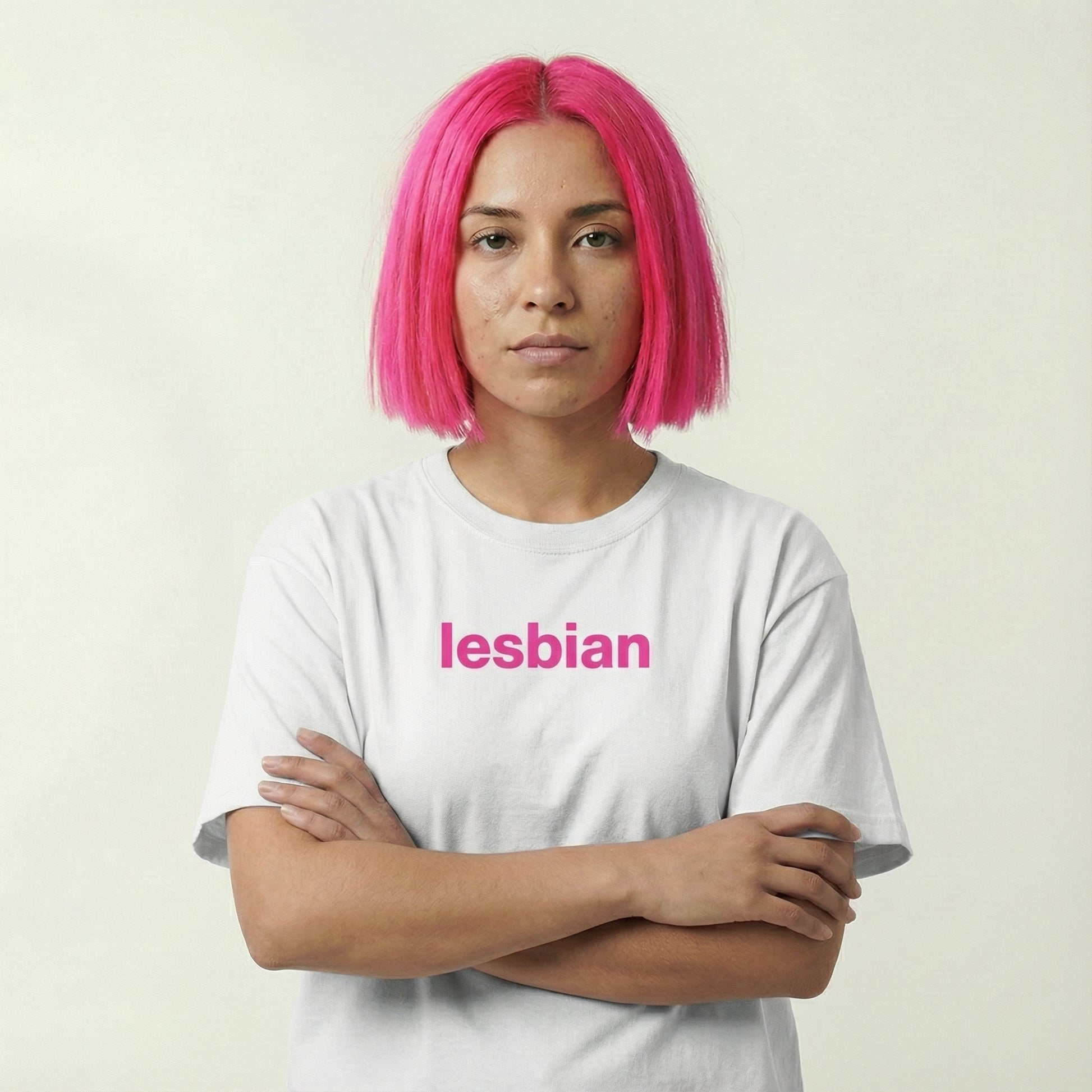 midweight, classic-fit cotton tee with front text reading “lesbian tee.”