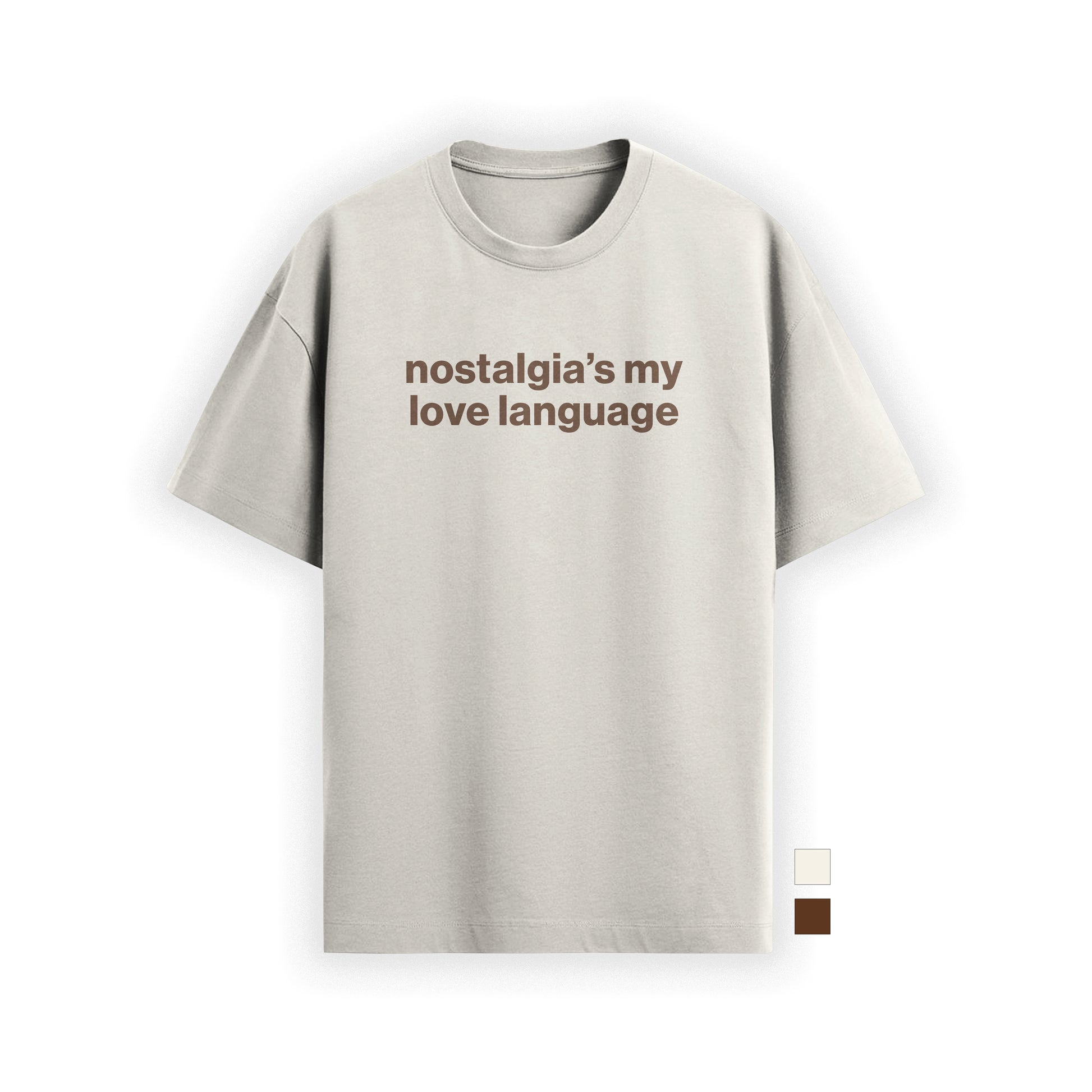 midweight, classic-fit cotton tee with front text reading “nostalgia’s my love language tee.”
