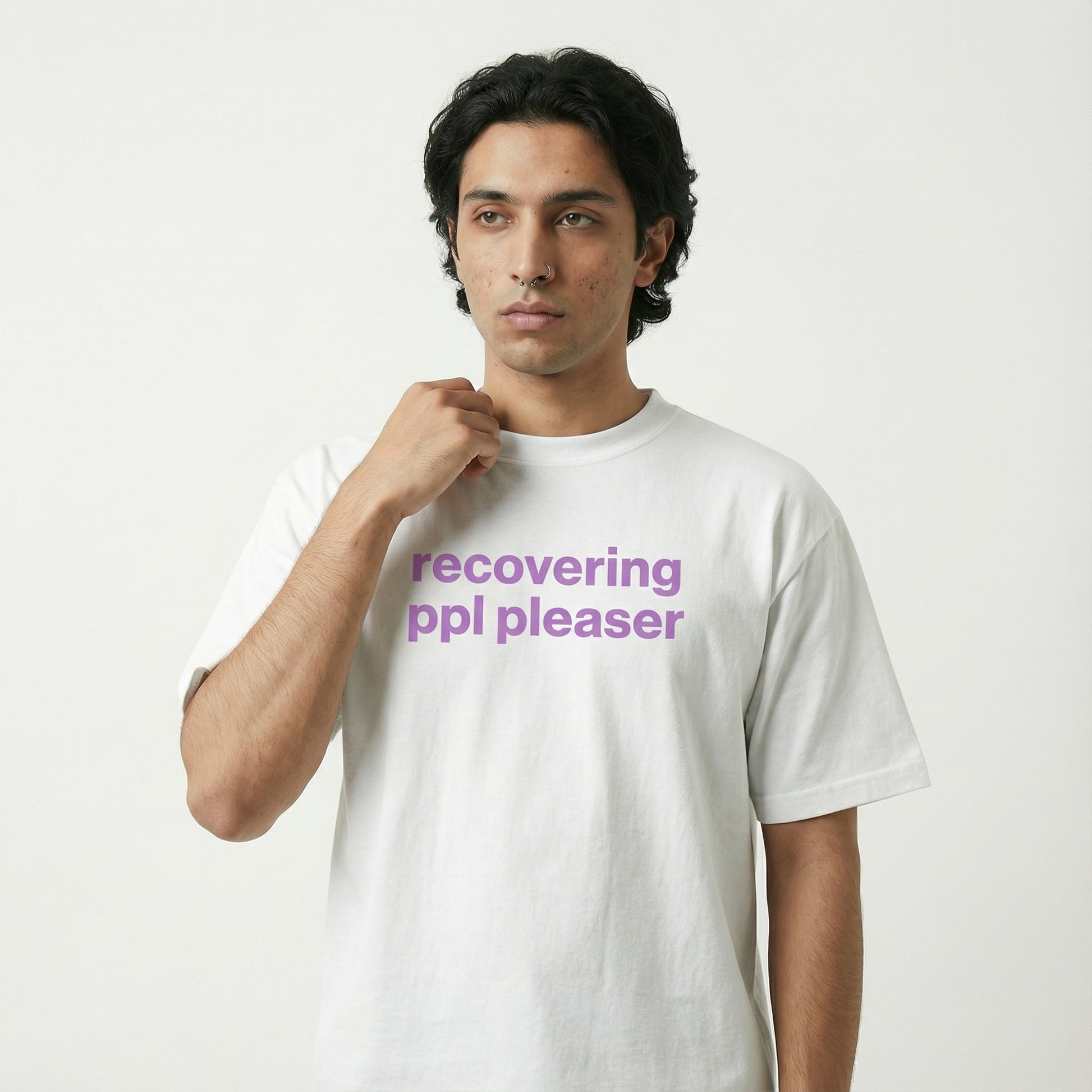 midweight, classic-fit cotton tee with front text reading “recovering ppl pleaser tee.”